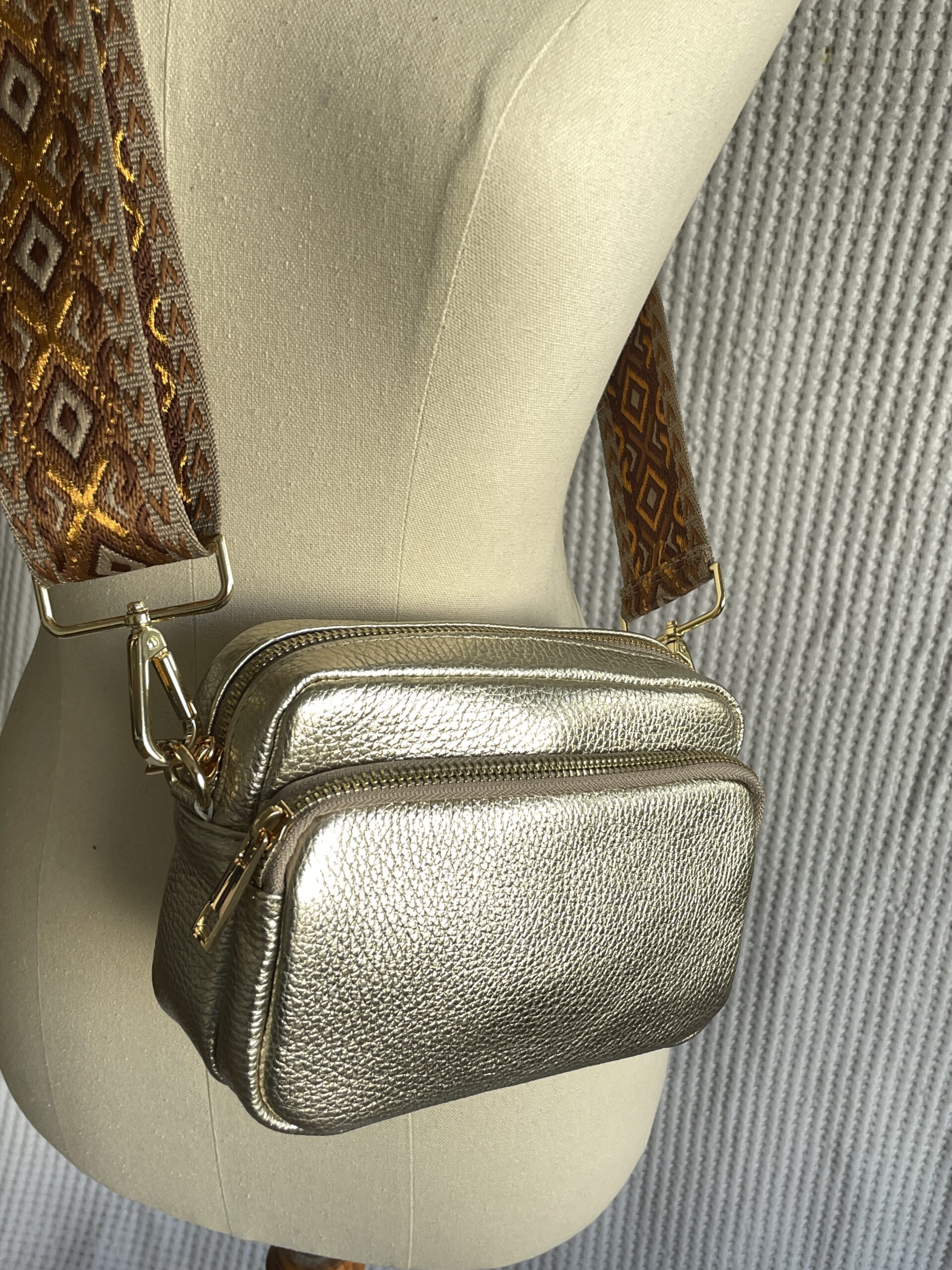 Leuk leren crossbody bag in het goud. Dit tasje heeft 2 vakken met ritssluitingen. Het voorvakje is klein maar je kunt er prima een zonnebril en telefoon in kwijt. Het achtervak is ruimer voor al je andere spullen.